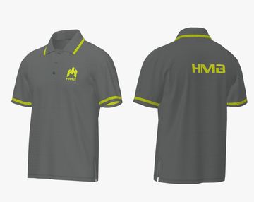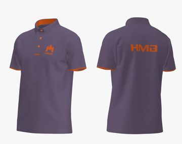 Purple polo shirt with bold orange HMB branding on front and back, vibrant and sporty design for standout style