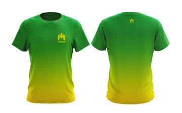 Green and yellow gradient t-shirt with dotted pattern, HMB branding, sleek abstract logo for a sporty look