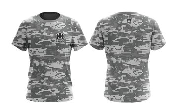 Gray digital camouflage t-shirt with HMB branding on front & back. A rugged and modern design for active wear.