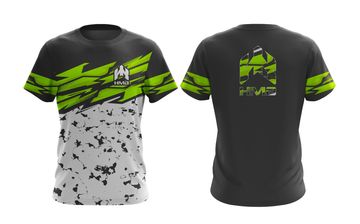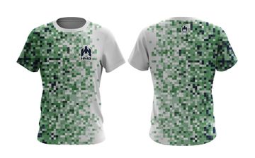 White t-shirt with green pixelated camouflage pattern, HMB branding on front and back. A bold and rugged.