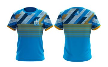 Blue sports jersey with dynamic geometric stripe pattern, Designed for performance and standout style.