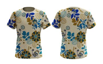Beige t-shirt with vibrant floral pattern and HMB branding. A lively and stylish design perfect for casual wear