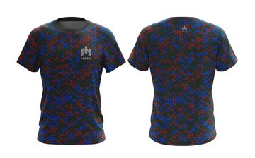 Black t-shirt with red and blue camouflage pattern. A bold and edgy design for active wear.